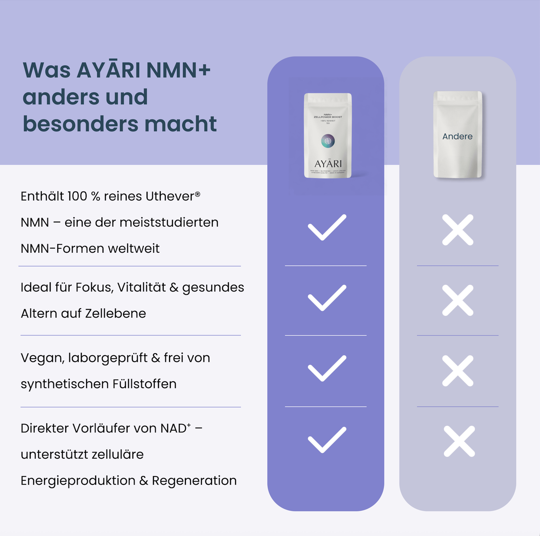 Vergleichsgrafik zu AYARI NMN+ mit Produktpackung, Check- und X-Symbolen sowie Vorteilen wie Reinheit, Qualität und Zellregeneration